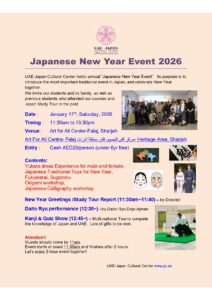 UAE日本文化センターでは、毎年恒例の「日本の新年イベント」を開催しています。 日時:2026年1月17日(土) 時間:午前11時30分~午後13時30分 会場 : Art for All Center-ファラジ、シャルジャ UAE支部長Majed Salem AlHammadi一門が演武いたします。